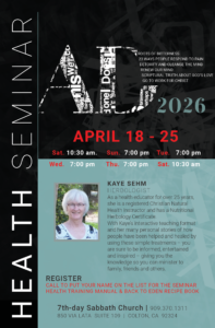 Kaye Sehm has been a health educator for over 25 years. She is a registered Christian Natural Health Instructor and has a Nutritional Herbology Certificate. Over twenty-five years ago she started to share with people the diet and lifestyle she was using. By incorporating the Eight Laws of Health and by following a Vegan Vegetarian diet, she noticed that many health-related problems vanished or were greatly helped. Her classes cover many topics such as natural home remedies, using herbs to help regain health and using water treatments. Over the past six years she has been involved in teaching people how to become Medical Missionaries. With Kaye’s interactive teaching format and her many personal stories of how people have been helped and healed by using these simple treatments – you are sure to be informed, entertained and inspired – giving you the knowledge so you can minister to family, friends and others.